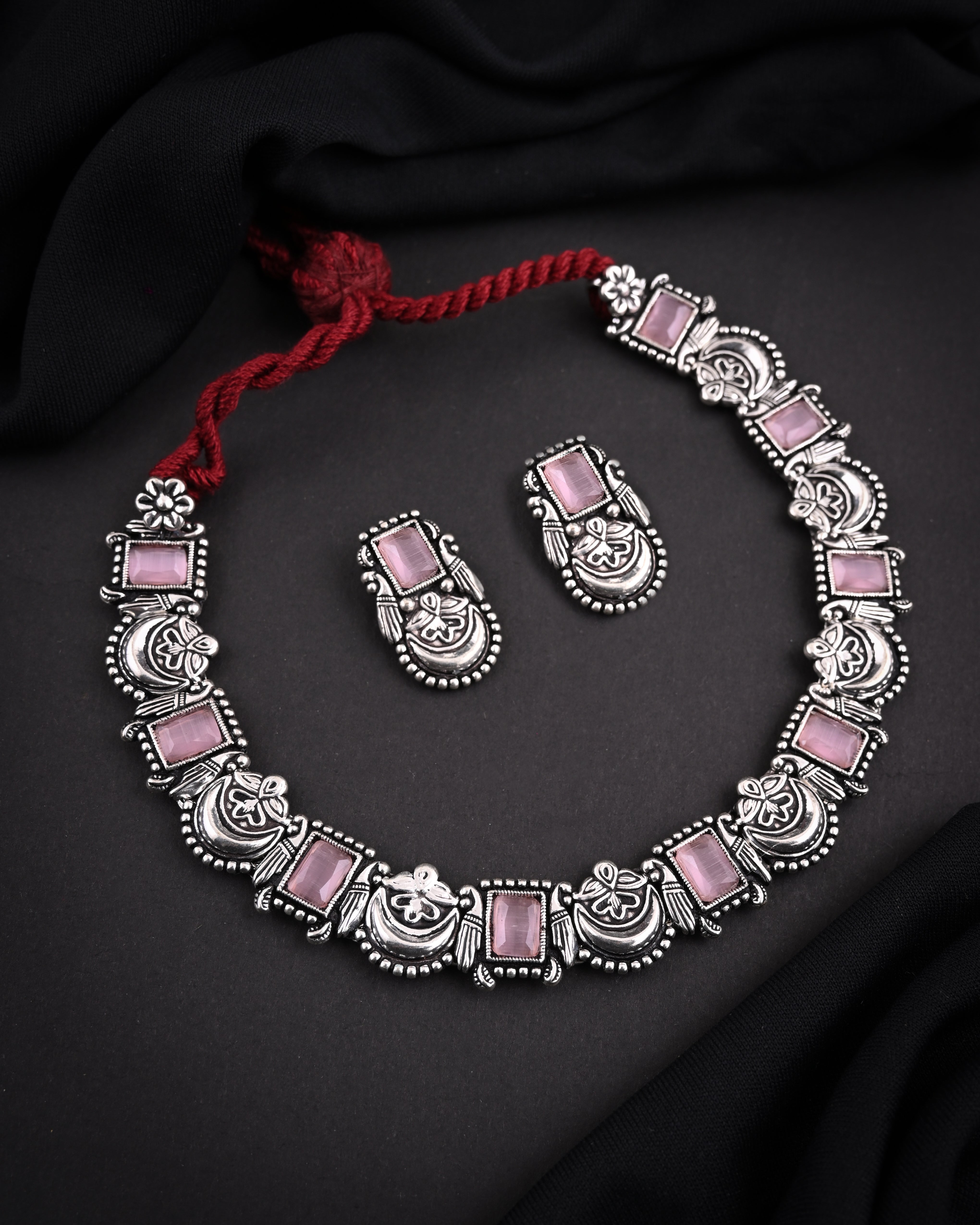 Our Oxidised Necklace combines traditional craftsmanship with contemporary flair, creating a statement piece that exudes timeless elegance. Made from high-quality metal and finished with an oxidised treatment, the necklace features a rich, darkened hue that adds depth and character. The intricate designs, often inspired by nature, heritage, or geometric patterns, make this necklace a perfect addition to any outfit—whether you're dressing up for a special occasion or adding a touch of sophistication to your everyday look. With its unique antique finish, this oxidised necklace is an essential accessory for those who appreciate vintage charm with modern appeal.
